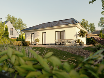 - Der Bungalow 78 ist das nächstgrößere Modell und ein wahrer Meister der Verwandlung. Drei verschieden verputzte Außenfassaden stehen in den Stilrichtungen Trend, Style und Elegance zur Auswahl. Als Alternative bietet sich eine robuste Klinkerfassade an. Der Grundriss des Bungalows ist ebenso wandelbar. Auf 78 Quadratmetern Grundfläche werden zwei Schlafzimmer, der Wohn- und Essbereich, eine abgetrennte Küche, ein Badezimmer mit Dusche und Badewanne und einHauswirtschaftsraum untergebracht. Diese Aufteilung ist ideal für kleine Familien oder Paare, die sich ein Extra-Schlafzimmer wünschen. Anstelle des zweiten Schlafzimmers kann der Raum in ein Gäste-WC mit anschließendem Garderobenbereich unterteilt werden. Dank der drei bodentiefen Fenster kann man den Garten direkt vom Schlafzimmer, der Küche und dem Essbereich betreten. Das Beste: Der Bungalow 78 kann mit einem Keller ergänzt und als Energiesparhaus gebaut werden.